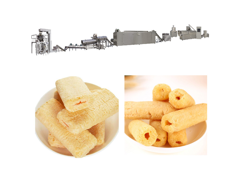 拌粉机→上料机→膨化机→注芯机→切断机→提升机→多层烤箱→提升机→喷油机→滚筒→包装机